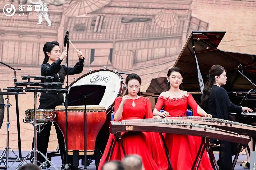 音樂會由詩朗誦《天目山:浮玉的歌唱》,以及浙音翡翠箏團帶來的古箏合奏《夢回臨安》《英雄贊歌》《綠風》暖場開幕。典雅精妙的樂曲中,既有“陌上花開緩緩歸”的雋雅秀美,又有“烽煙滾滾唱英雄”的慷慨激昂,現場觀眾們瞬間被帶入一場綺麗的水鄉故夢中,在音樂中遍覽繁花似錦、璀璨明亮的錦繡山河。