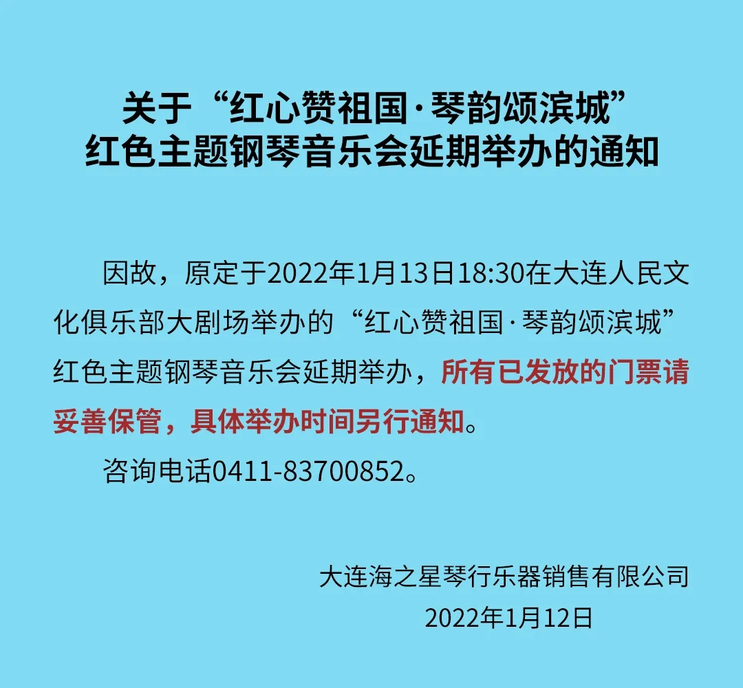 緊急通知丨大連紅色主題鋼琴音樂會(huì)演出推遲